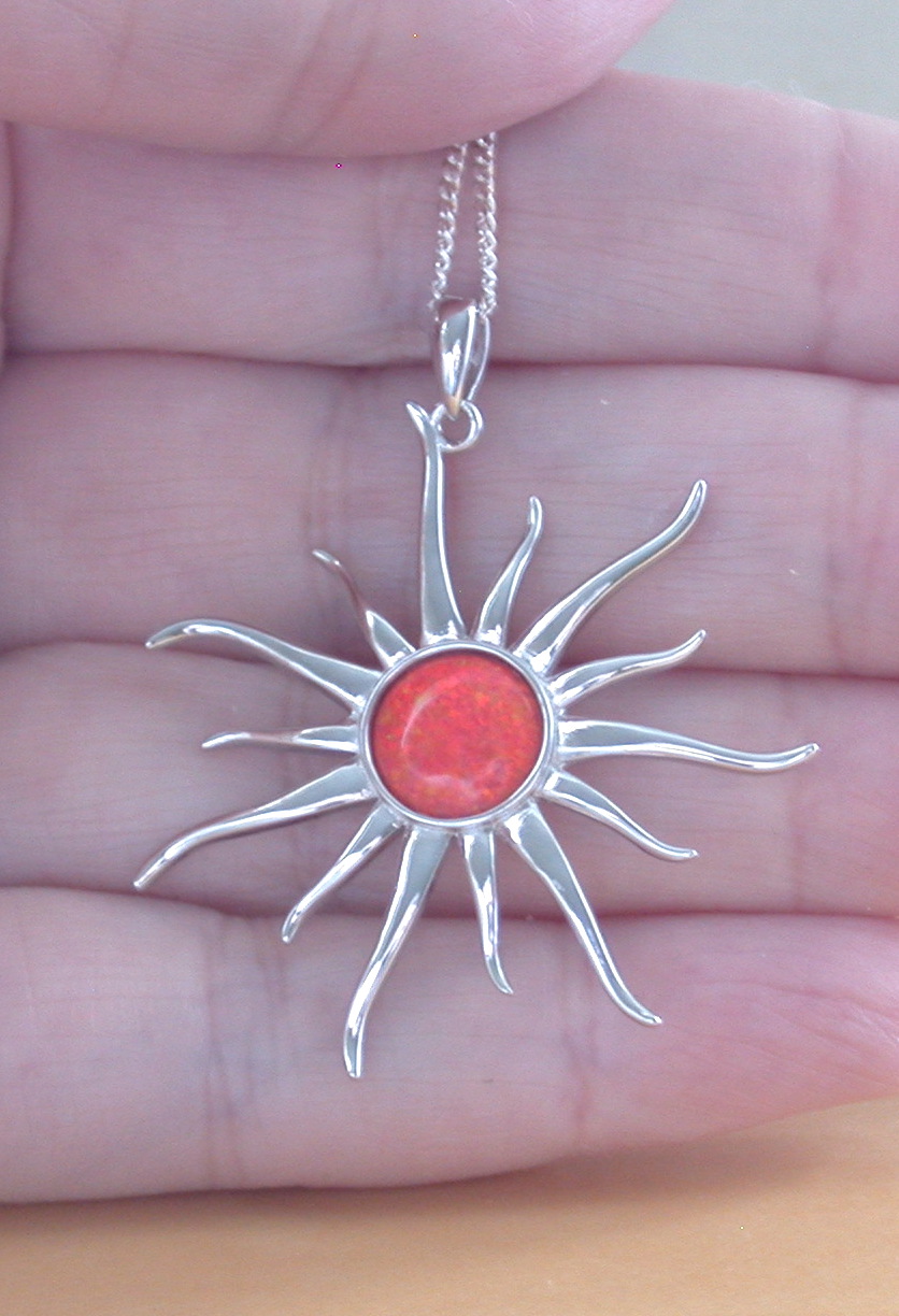 Sterling silver, fire opal gemstone (lab created) sun pendant. The pendant measures 35mm height x 35mm width. The opal gemstone measures 9mm. These opal sun earrings measure 20mm height x 20mm width. The white opal gemstone measures 5mm. Stamped 925. Opal is the birthstone for October.