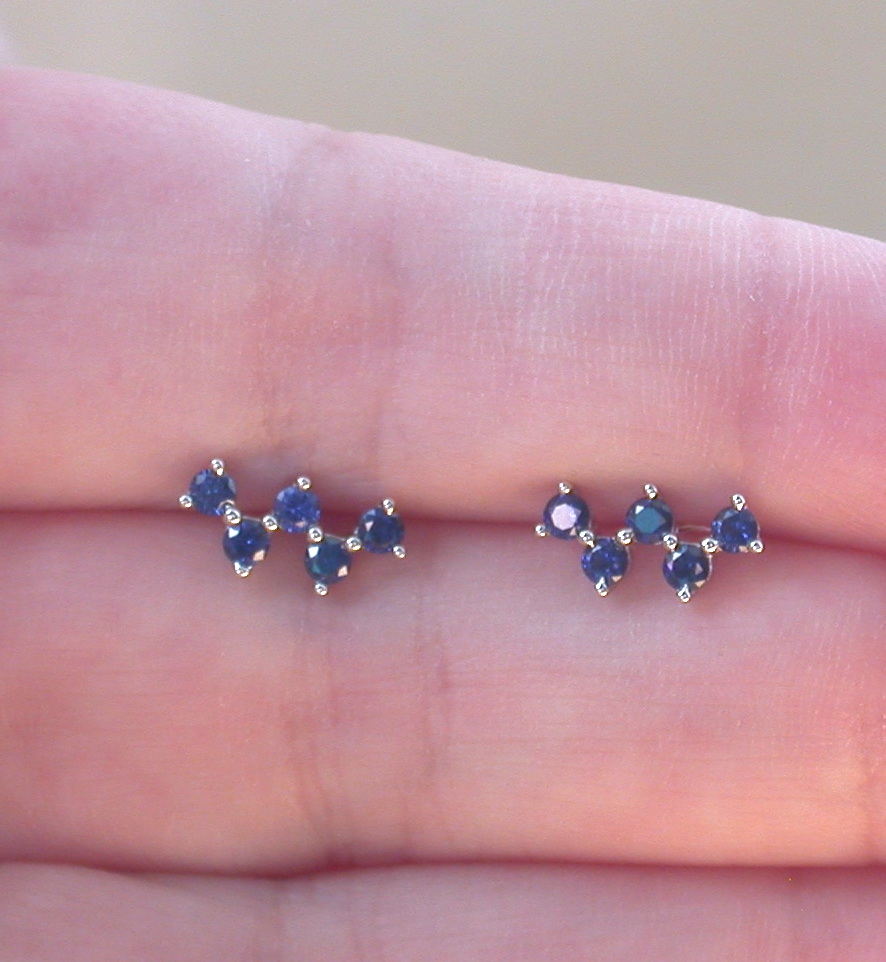 Sterling silver sapphire (lab created) gemstone five dot stud earrings. These earrings measure 12mm width x 5mm height. Stamped 925. Sapphire is the birthstone for September.